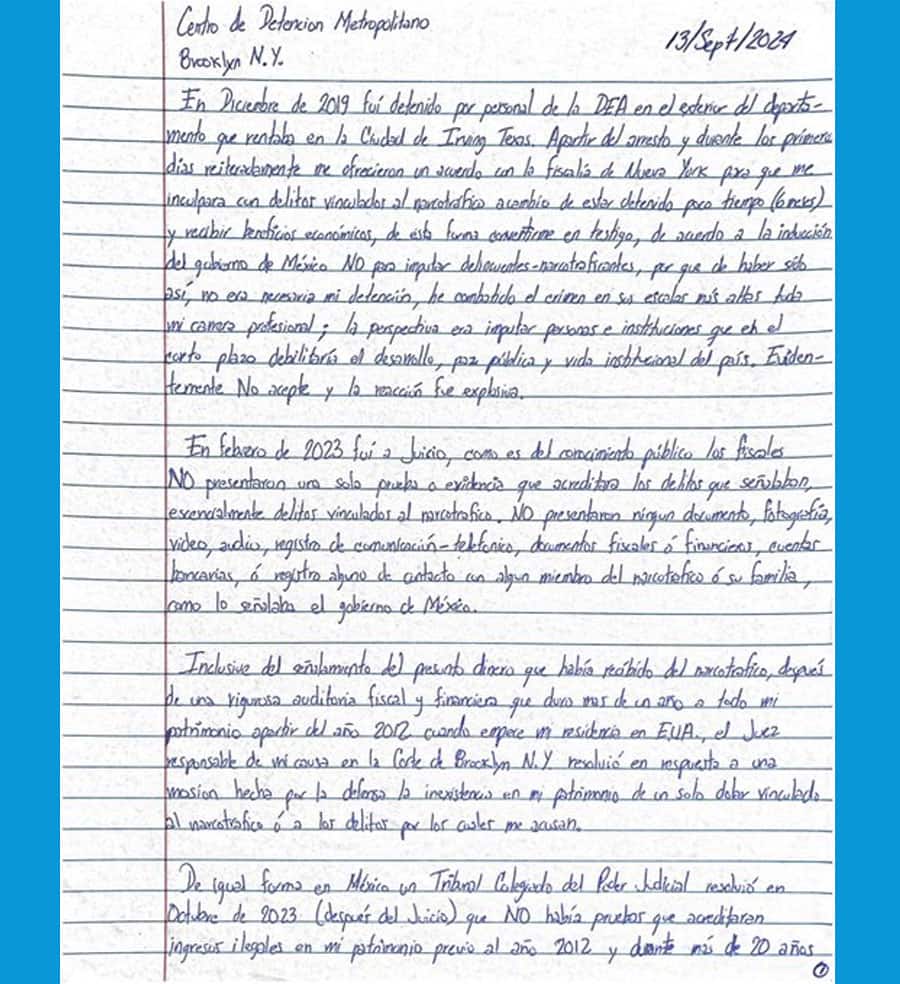 “A partir del arresto y durante los primeros días reiteradamente me ofrecieron un acuerdo con la Fiscalía de Nueva York, para que me inculpara con delitos vinculados al narcotráfico, a cambio de estar detenido poco tiempo (6 meses) y recibir beneficios económicos, de esta forma convertirme en testigo, de acuerdo a la inducción del gobierno de México. No para imputar delincuentes-narcotraficantes”.