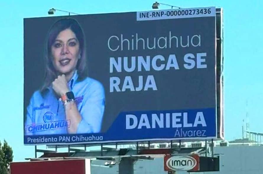 CHIHUAHUA, CHIH.- Durante la madrugada de ayer apareció un espectacular con la imagen de Daniela Álvarez Hernández, presidenta estatal del Partido Acción Nacional (PAN).