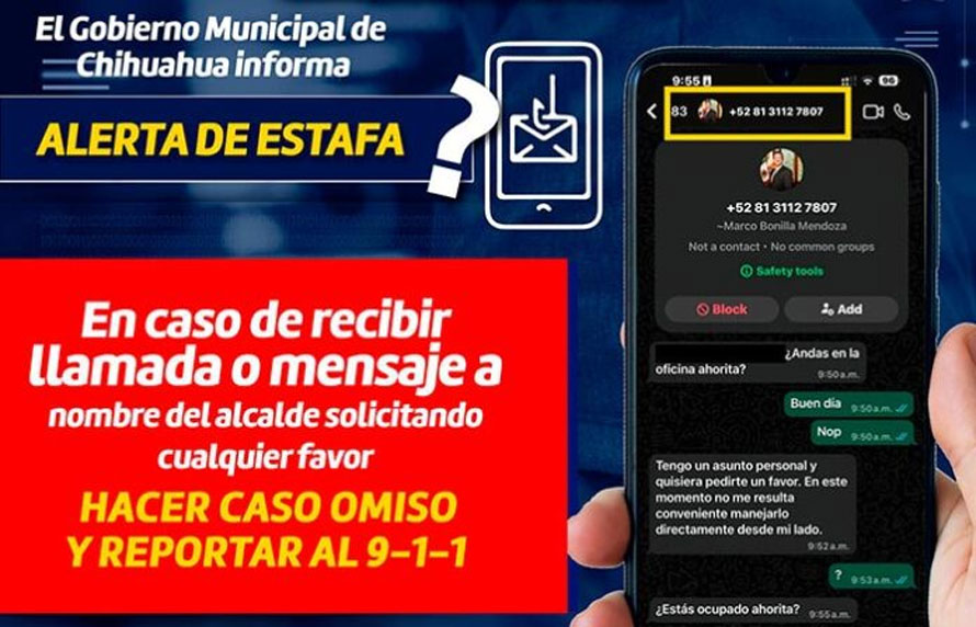CHIHUAHUA CHIH.- El Gobierno Municipal de Chihuahua emitió una alerta a la ciudadanía por intentos de fraude, luego de detectar números telefónicos que suplantan la identidad del alcalde Marco Bonilla para solicitar favores y posibles apoyos económicos a través de WhatsApp.