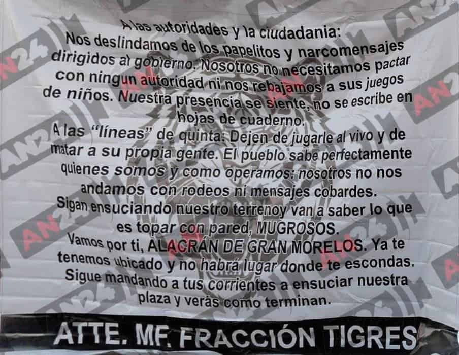 De acuerdo con los primeros reportes, los mensajes estaban dirigidos tanto a autoridades como a integrantes de grupos contrarios, incluyendo amenazas directas contra una persona identificada con el alias “Alacrán de Gran Morelos”. En el texto, los responsables también se deslindan de otros mensajes previamente difundidos en la región.