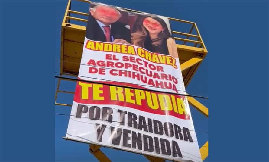 Pero no fue sólo el desaire de los habitantes de la región. También hubo exhibición pública: lonas elevadas varios metros mostraban una fotografía de la senadora junto al también senador Adán Augusto López, acompañada de la leyenda: “Andrea Chávez, el sector agropecuario de Delicias te repudia por traidora y vendida”.