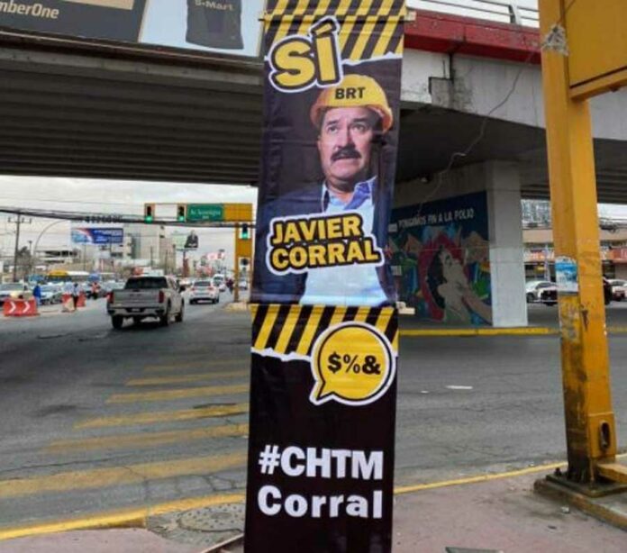 CD. JUAREZ CHIH.- En la mañana del martes se observaron varios pendones en diferentes puntos de la ciudad a través de los cuales se responsabiliza al Ex Gobernador Javier Corral del tráfico insoportable de está ciudad con motivo de las obras del BRT 2.