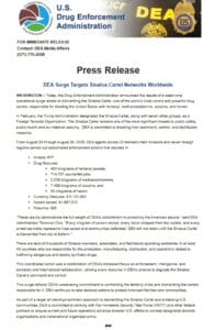 EU.- La Administración para el Control de Drogas (DEA, por sus siglas en inglés) informó que llevó a cabo operaciones a nivel global contra el Cártel de Sinaloa, destacando que detuvo a 617 presuntos integrantes del grupo delictivo e incautó más de 10 toneladas de drogas.