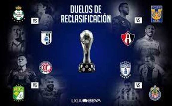 Los cruces de la Repesca Santos vs. Atlético de San Luis Sede: Estadio TSM Corona Fecha tentativa: domingo 21 de noviembre Horario posible: 20:06 horas. Toluca vs. Pumas Estadio: Nemesio Diez Fecha tentativa: domingo 21 de noviembre Horario posible: 12:00 horas Puebla vs. Chivas Sede: Estadio Cuauhtémoc Fecha tentativa: sábado 20 de noviembre Horario posible: 19:00 horas Cruz Azul vs. Monterrey Sede: Estadio Azteca Fecha tentativa: sábado 20 de noviembre Horario posible: 21 horas Cuál es el formato aprobado por la Liga MX Los partidos del Repechaje se disputarán a partido único en la sede de los cuatro clubes que se ubiquen en mejor posición en la tabla. Por regla, dos serán en sábado y los otros dos en domingo.