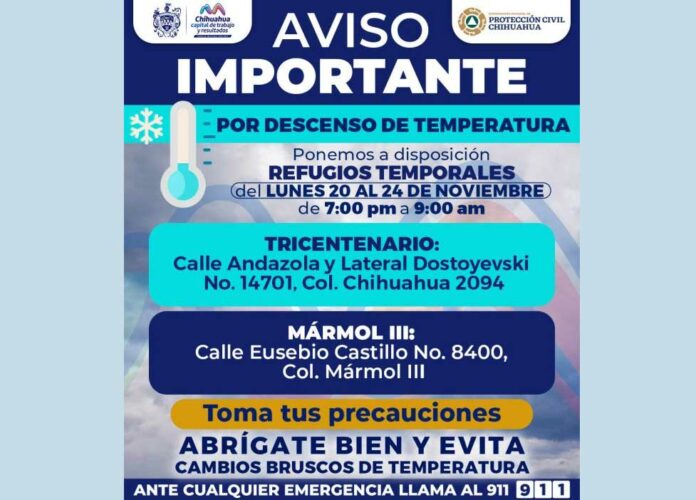 CHIHUAHUA CHIH.- El Gobierno Municipal, a través de la Coordinación Municipal de Protección Civil, recuerda que a partir de este lunes 20 de noviembre se prevé un considerable marcado descenso en las temperaturas, por lo cual reitera que abrirán dos refugios temporales para las personas que se encuentren en la necesidad de utilizarlos.