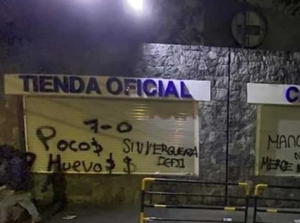 “Pocos huevos”, “Sinvergüenzas”, “Mancharon nuestra historia”, son algunas de las frases que se pueden leer en las cortinas de los locales de la tienda oficial de Cruz Azul en las instalaciones de La Noria.