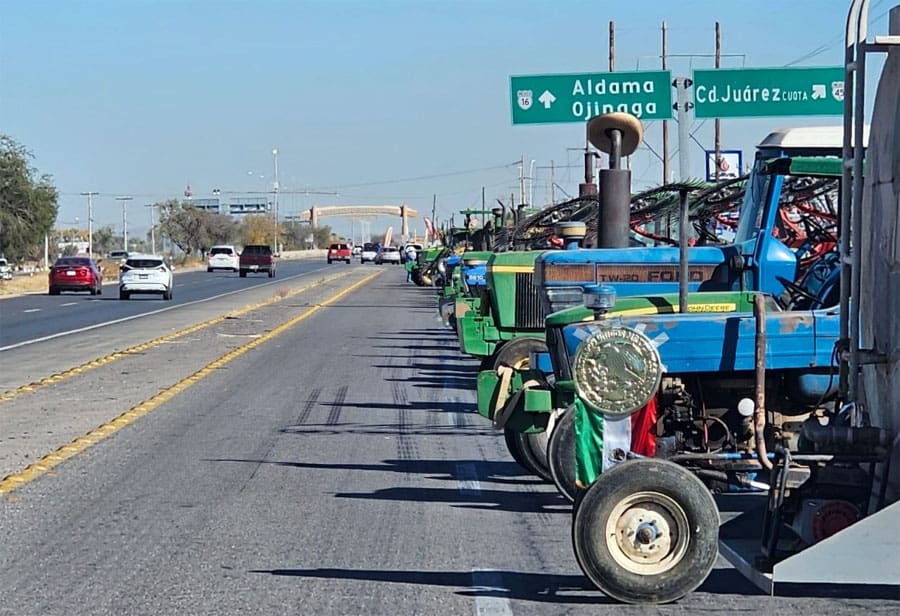 ALDAMA.- Alrededor de 30 tractores bloquearon completamente este sábado la carretera Chihuahua-Aldama, a la altura del Libramiento Oriente, en ambos sentidos de circulación, como medida de presión contra la reciente reforma a la Ley de Aguas del Estado de Chihuahua.