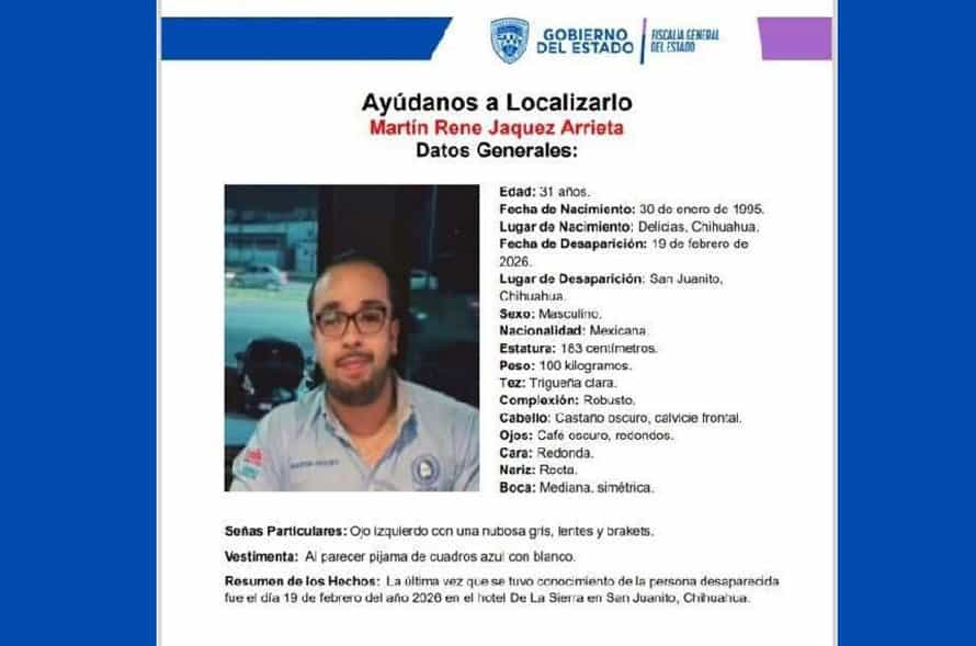 CHIHUAHUA CHIH.- La Fiscalía General del Estado emitió una solicitud de apoyo a la ciudadanía para localizar a Martín René Jáquez Arrieta, de 31 años, quien fue visto por última vez ayer 19 de febrero, en la comunidad de San Juanito, municipio de Bocoyna.