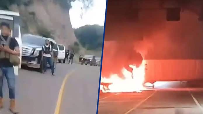 Usuarios y transportistas difundieron un video en redes sociales, donde se puede observar un par de vehículos de carga pesada atravesados e incendiados, además mostraron casquillos de grueso calibre, ponchallantas y advirtieron sobre los riesgos.
