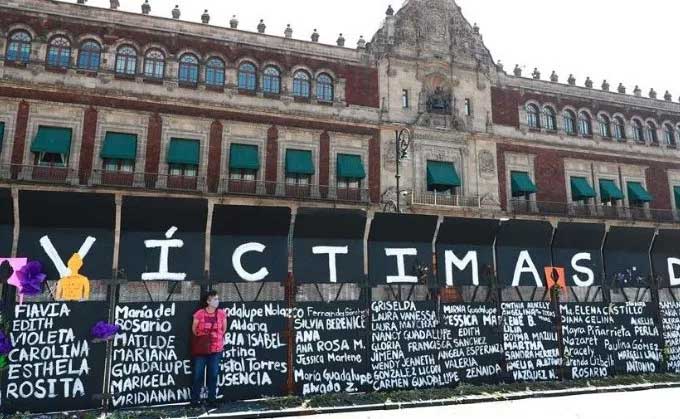 CDMX.- Los nombres de miles de víctimas de feminicidios fueron plasmados en las vallas de seguridad que resguardan en Palacio Nacional.