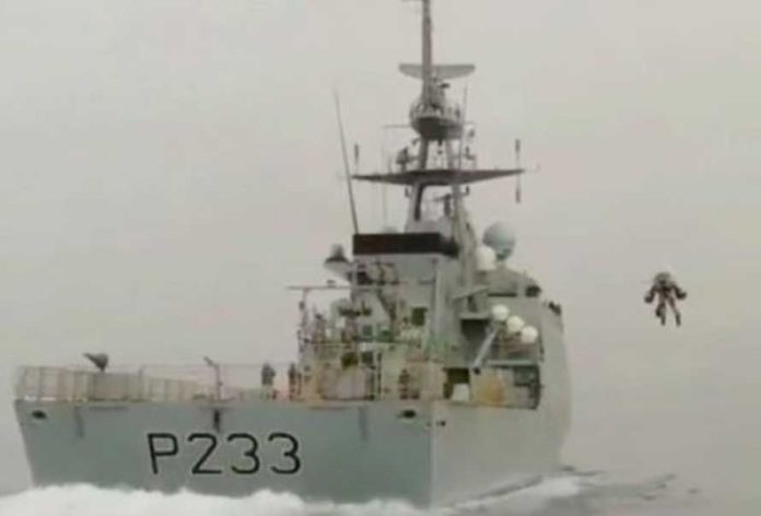 Los hombres que probaron los trajes despegaron desde botes inflables y, luego de avanzar un buen tramo sobre el mar, aterrizaron en un barco patrullero de la clase Royal Navy Batch 2 River HMS Tamar.