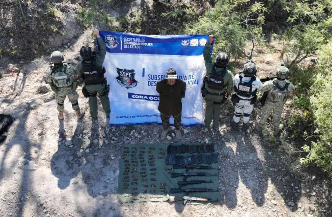 MOORIS CHIH.- Elementos de la policía de Despliegue de la Secretaría de Seguridad Pública del Estado (SSPE), en colaboración interinstitucional con la Guardia Nacional y el Ejército Mexicano, llevaron a cabo la detención de José Rogelio R., originario de Culiacán, a quien se le aseguró un arsenal de alto poder en una brecha del municipio de Moris.