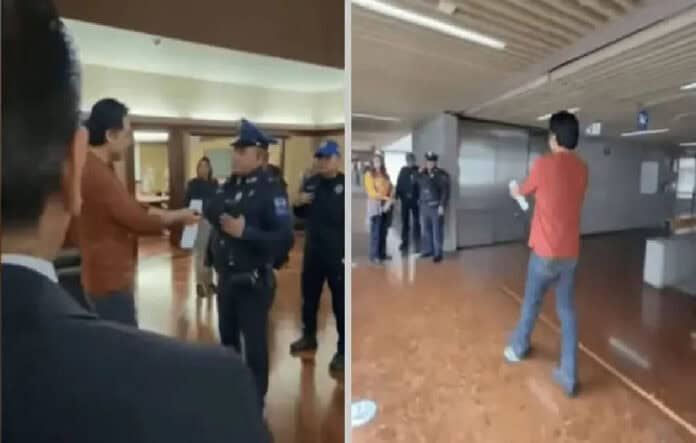 En un video de aproximadamente 10 minutos difundido a través de sus redes sociales, Marx Arriaga Navarro, hasta entonces Director General de Materiales Educativos, documentó el momento en que elementos de la policía capitalina y funcionarios de la dependencia le solicitaban desalojar su oficina en Avenida Universidad 1200.