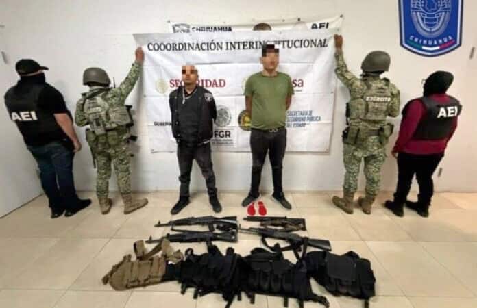 CHIHUAHUA CHIH.- Como resultado de una investigación por delitos contra la salud, la Fiscalía de Distrito Zona Sur cumplimentó una orden de cateo, intervención en la que detuvo en flagrancia a dos masculinos con armas de fuego, un vehículo con reporte de robo y diversos objetos de interés criminalístico.