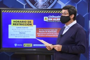 En cuanto al Acuerdo del 10 de agosto, reiteró que ha sido nuevamente ajustado el lunes 2 de noviembre con el horario de restricción, que significa que se restringe la movilidad dentro del territorio del estado de Chihuahua, de lunes a jueves, de las 19:00 horas (7 de la tarde), a las 6:00 horas; y los fines de semana, a partir de las 19:00 horas del viernes, hasta las 6:00 am del lunes.