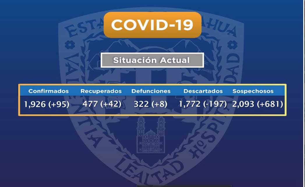 El Reporte COVID-19 Conferencia Informativa #107 – Virtual #64, indica que de los 1,926 confirmados, 1,187 pertenecen a Juárez, 520 a Chihuahua, 6 Bachíniva, 19 Cuauhtémoc, 8 Ojinaga, 3 Namiquipa, 26 Meoqui, 1 Julimes, 2 Camargo, 2 Saucillo, 4 Ahumada, 2 Guadalupe D.B., 12 Guachochi, 30 Delicias, 4 Ascensión, 1 Guerrero, 2 Bocoyna, 2 Madera, 56 Parral, 2 Buenaventura, 1 Temósachi, 1 Galeana, 3 Guadalupe y Calvo, 10 Nuevo Casas Grandes, 2 Rosales, 4 Jiménez, 2 Aldama, 1 Santa Bárbara, 2 Ignacio Zaragoza, 1 López, 4 Urique, 2 Janos, 1 San Francisco del Oro, 1 Guazapares, 1 Allende y 1 Coronado.