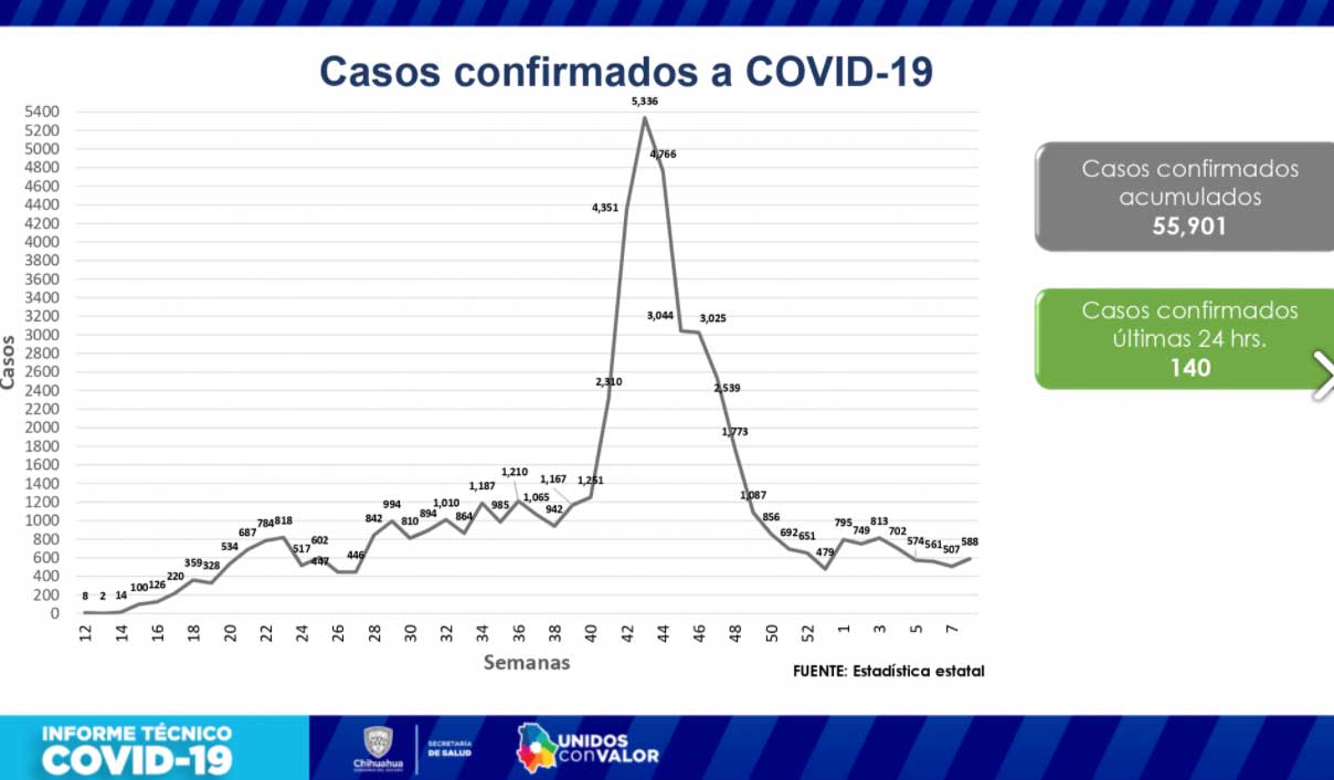 CHIHUAHUA CHIH.- Con 140 contagios y un deceso que reporta la Secretaría de Salud en las últimas 24 horas, suman un total general de 55 mil 901 casos confirmados y 5 mil 420 fallecimientos por COVID-19 en la entidad.