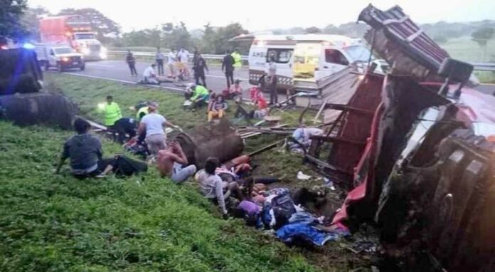 Fue a las 5:40 a.m. cuando se produjo la volcadura del camión Ford tipo Súper Duty, el cual iba a exceso de velocidad y terminó por volcar en el kilómetro 134, dentro del municipio de Pijijiapan. Los migrantes salieron disparados de la redila de donde viajaban.