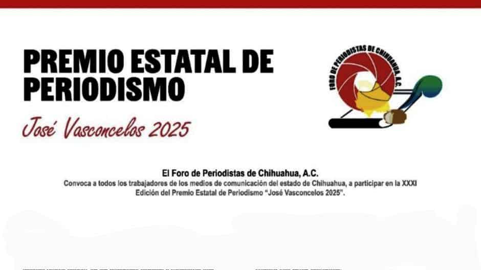 CHIHUAHUA CHIH.- El Foro de Periodistas de Chihuahua, A.C. emitió la convocatoria para la XXX Edición del Premio Estatal de Periodismo “José Vasconcelos 2025”, dirigida a todos los trabajadores de los medios en el estado. Podrán concursar únicamente quienes ejerzan la profesión en Chihuahua y laboren en algún medio impreso, radio, televisión o internet.