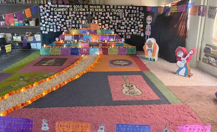 La creación del altar estuvo a cargo de la maestra Gaby Murillo y un grupo de madres de familia, quienes invitaron a toda la comunidad escolar a participar llevando fotografías de sus difuntos para incluirlas en la ofrenda.