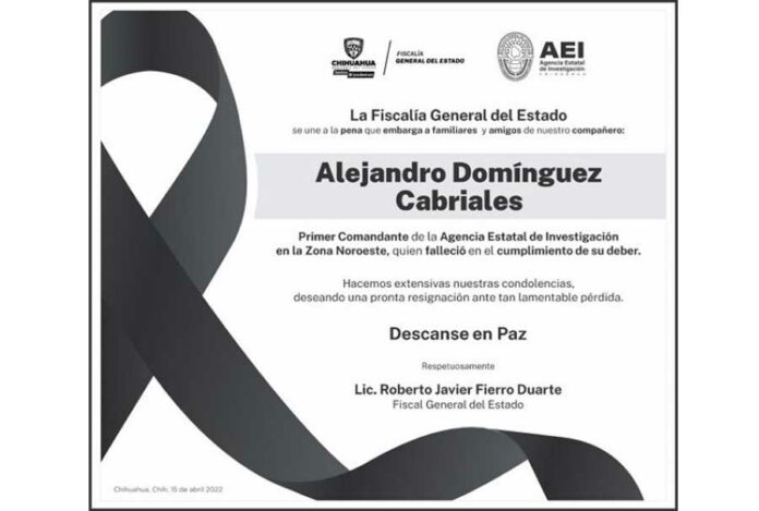 La dependencia condenó el asesinato del Primer Comandante de la Agencia Estatal de Investigación en la Zona Noroeste, Alejandro Domínguez Cabriales.