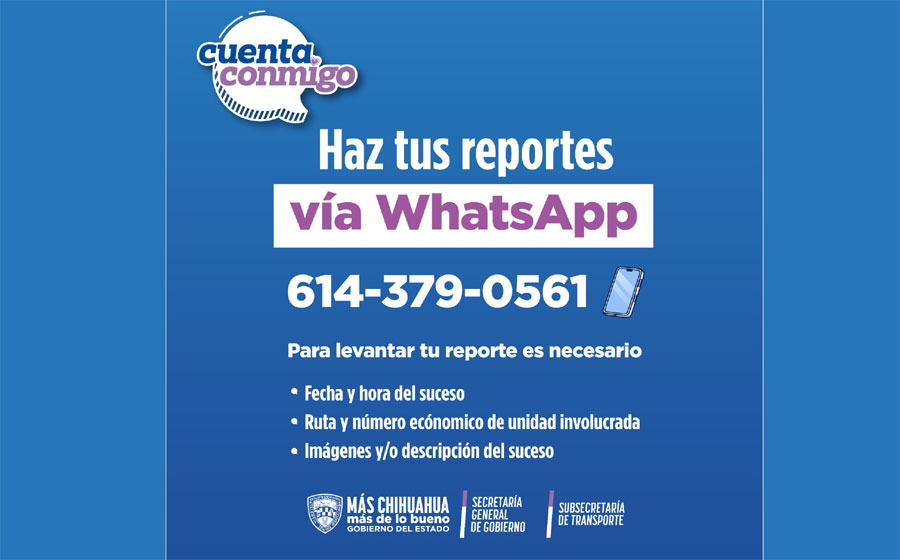 Las y los usuarios podrán enviar sus quejas o incidencias al número 614-379-0561, proporcionando datos clave como la ruta, el número económico de la unidad, una breve descripción de lo ocurrido, así como la fecha y hora del incidente, con el fin de agilizar la atención.