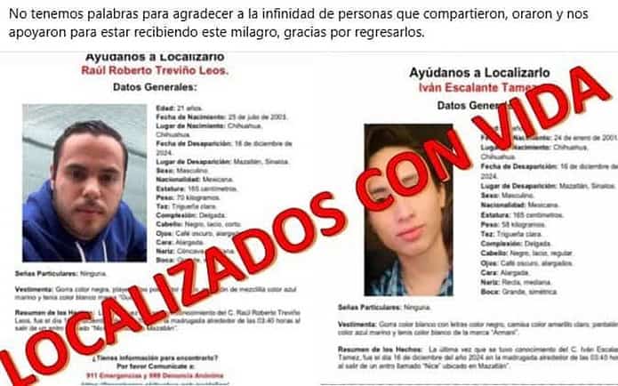 CHIHUAHUA CHIH.- Los jóvenes chihuahuenses Iván Alejandro Escalante Támez y Roberto Treviño Leos, desaparecidos en Mazatlán, Sinaloa hace una semana fueron encontrados con vida, según informó Diana Leos, madre de Roberto, Diana.