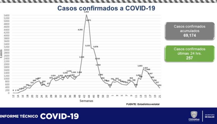 CHIHUAHUA CHIH.- La Secretaría de Salud estatal informó en su reporte epidemiológico que se confirmaron 257 casos de COVID-19 así como nueve decesos, los cuales se registraron en Juárez (5) y el resto en Ahumada, Allende, Temósachic y Carichí.