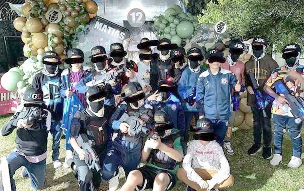 Circula una foto con los niños portando armas y metralletas de juguete, todos usaban capuchas junto con gorras que decían “Chapiza” relacionadas al nombre del narcotraficante mexicano Joaquín “El Chapo” Guzmán y cuyos derivados también aluden al nombre que reciben sicarios al servicio de Los Chapitos, hijos de “El Chapo”, publicó el Diario Reforma.