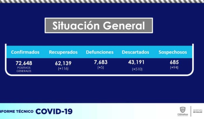 El número de personas fallecidas subió a 7 mil 683 al registrarse cinco decesos más, 2 de Ciudad Juárez, 1 Chihuahua, 1 Parral y 1 Nuevo Casas Grandes.