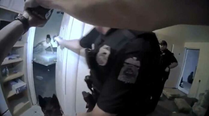 En un video policial grabado con cámaras corporales se puede ver que, tras esposar a dos hombres que salieron de la vivienda, un perro policía alerta que en el lugar se encuentra otra persona.
