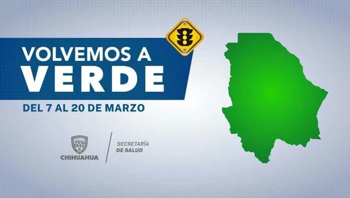 La Secretaría de Salud del Estado de Chihuahua informó que a partir del lunes 7 de marzo la entidad transitará a semáforo epidemiológico verde, esto tras la disminución de casos, hospitalizaciones y defunciones por COVID-19.