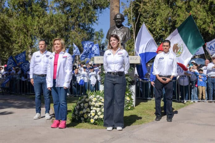 Previo a subir al histórico kiosko donde Don Luis realizó su huelga de hambre en protesta por el fraude electoral, Maru Campos, Daniela Álvarez, Presidenta del PAN Chihuahua, Jorge Romero, Presidente Nacional del PAN y los presidentes municipales, Marco Bonilla y Jesús Valenciano montaron una guardia de honor y colocaron una ofrenda floral.