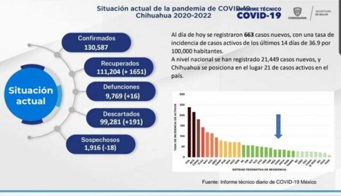A nivel nacional se registra 21 mil 449 casos nuevos y el estado de Chihuahua se encuentra en el lugar número 21 de casos activos en el país, además se tiene una tasa activa de 36,9 casos de COVID-19 por cada 100 mil habitantes.