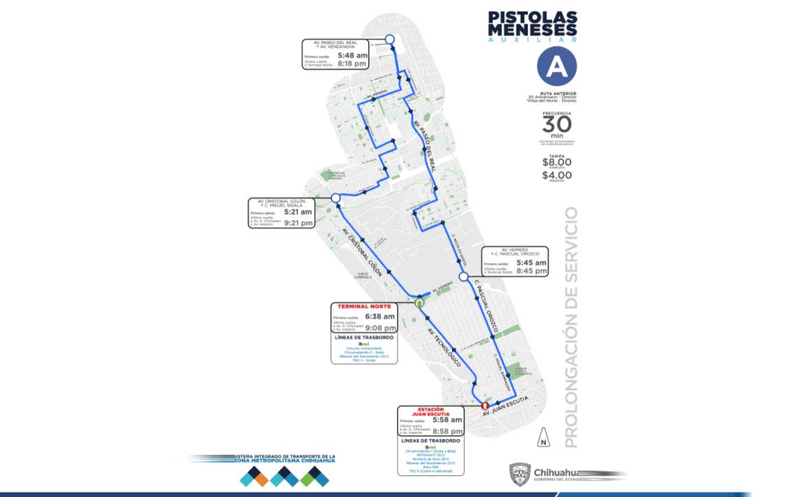 CHIHUAHUA CHIH.- La Dirección de Transporte del Gobierno del Estado dio a conocer que a partir del próximo lunes 10 de mayo iniciará el servicio de la línea Pistolas Meneses, en la cual se fusionaron las rutas 20 Aniversario y Villas del Norte en la ciudad de Chihuahua.