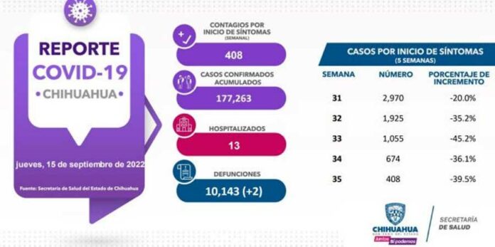 CHIHUAHUA CHIH.- El Gobierno del Estado, a través de la Secretaría de Salud de Chihuahua, presenta este 15 de septiembre el reporte COVID-19, en el cual se registra un acumulado de 177 mil 263 (+102) casos confirmados, 408 casos por inicio de síntomas y 13 pacientes hospitalizados.