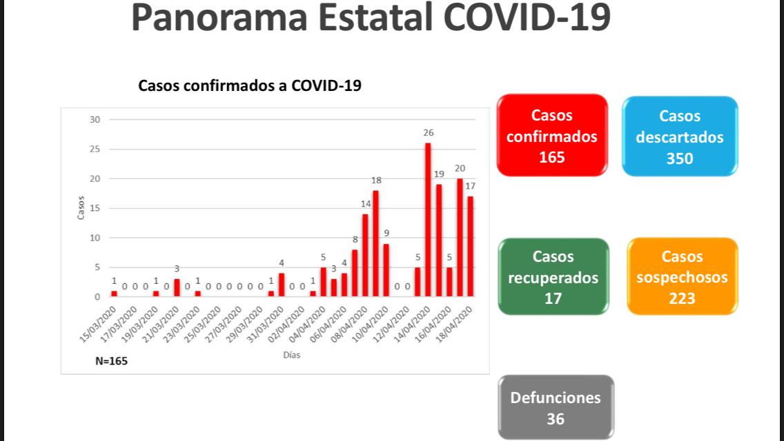 CHIHUAHUA CHIH.- El número de defunciones a causa de COVID-19 en el estado de Chihuahua ascendió a 36 y la cifra de casos confirmados con contagio es de 165, dio a conocer José Valenzuela Zorrilla, director médico de la Secretaría de Salud en la Zona Norte.