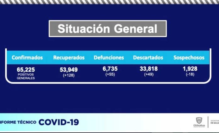 CHIHUAHUA CHIH.- El estado de Chihuahua llegó a 6 mil 735 defunciones y 65 mil 225 contagios de COVID-19 en las últimas 24 horas, informó la Secretaría de Salud en su reporte diario.