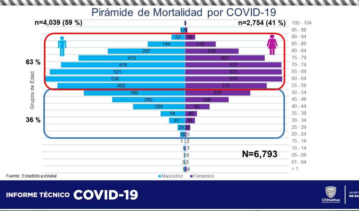 CHIHUAHUA CHIH.- El Reporte COVID-19 de la Secretaría de Salud muestra que hay un total general de 65 mil 987 contagios, tras confirmarse otros 158 nuevos positivos; mientras que el número de personas fallecidas incrementó en 12, con lo que suman ya 6 mil 793 muertes en los 14 meses de haber iniciado la pandemia en el estado.