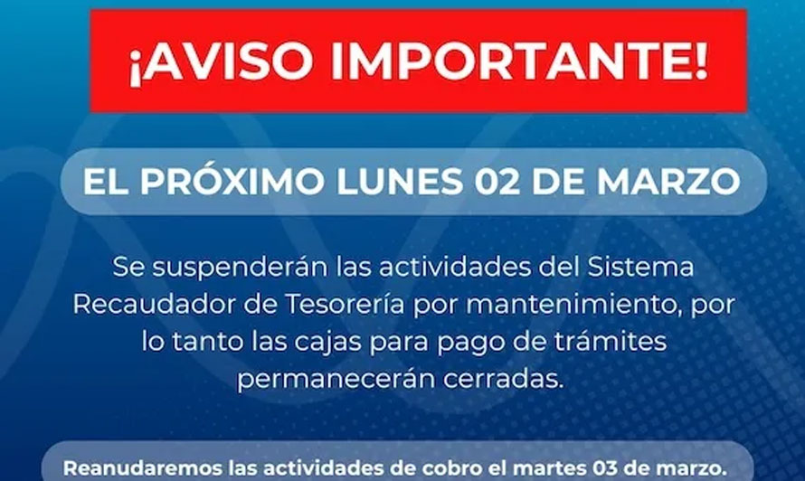 CHIHUAHUA CHIH.- El Gobierno Municipal de Chihuahua, informa a la ciudadanía que el próximo lunes 2 de marzo el sistema recaudador permanecerá fuera de servicio debido a trabajos de mantenimiento programado, por lo que no podrán realizarse pagos en áreas de la Dirección de Desarrollo Urbano y Ecología, así como otros servicios que requieran el uso de dicho sistema.
