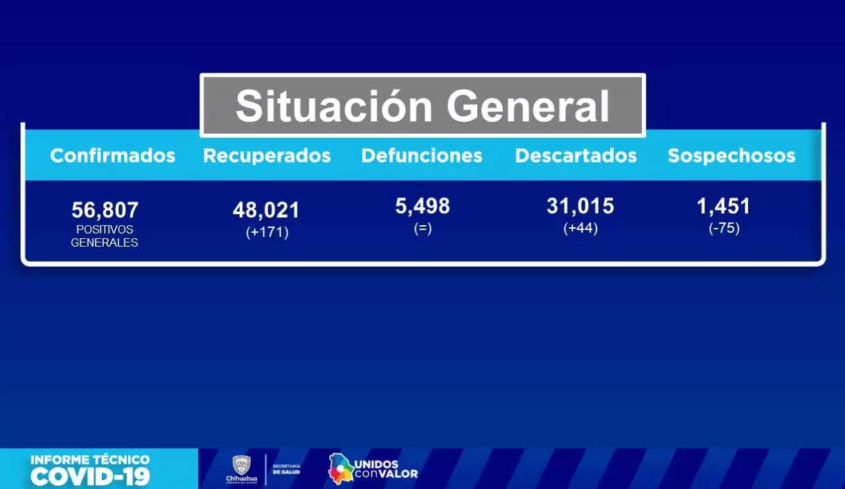 CHIHUAHUA CHIH.- Con 61 contagios registrados en las últimas 24 horas, el estado de Chihuahua llegó a 56 mil 807 casos confirmados de COVID-19, informó la Secretaría de Salud en el último reporte epidemiológico correspondiente a este 15 de marzo.