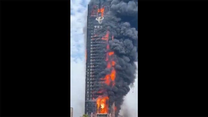 El edificio, de 42 plantas en la superficie, formaba parte de la empresa estatal de telecomunicaciones China Telecom y en redes sociales se volvieron virales los videos de las llamas arrasando todo un costado del edificio.
